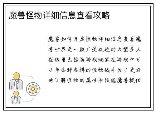 魔兽世界如何显示怪物血量 1. 引言 魔兽世界是一款广受欢迎的大型多人在线角色扮演游戏,玩家在游戏中扮演各种角色与怪物进行战斗。为了更好地了解战斗进展和制定战略,显示怪物血量成为了一个重要的功能。本文将详细介绍魔兽世界中显示怪物血量的方法。 2. 默认界面 在魔兽世界中,默认情况下是没有显示怪物血量的。这是为了增加游戏的挑战性和真实感。玩家需要通过观察怪物的表现和自己的技能伤害来判断怪物的血量情况...